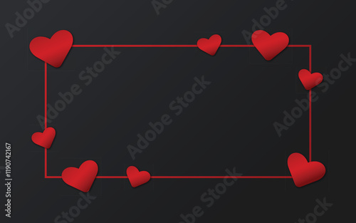 valentine hearts frame background. red heart on black background. top view. copy space for text.
