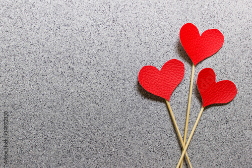 Valentine love simple background with three red fabric hearts on wooden sticks on gray background. Photo with copy blank space.