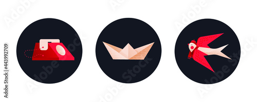 Valentine Set. Modern Flat Vector Concept Illustrations. Badges with Red Phone, Paper Ship with I Love You Texture, Bird. Social Media Ads.
