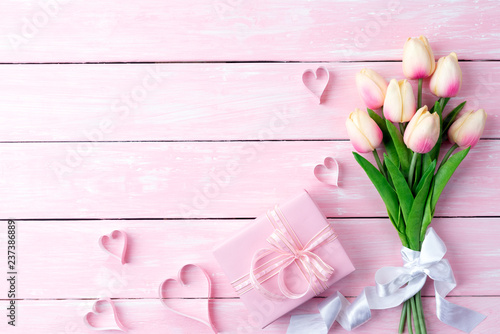 Valentines day and love concept. Pink paper hearts with gift box and tulips with ribbon on pink pastel wooden background.