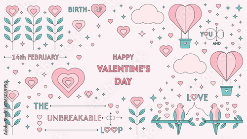 Valentine's Day background design with birds, hearts, stars, clouds, and leaves. Vector illustration.