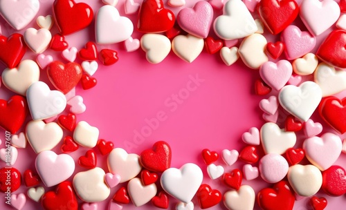 Valentine's day background, heart-shaped candies, red white and pink colors, circular arrangement, vibrant pink background, close-up photography, festive, romantic, sweet confectionery, love-themed, c
