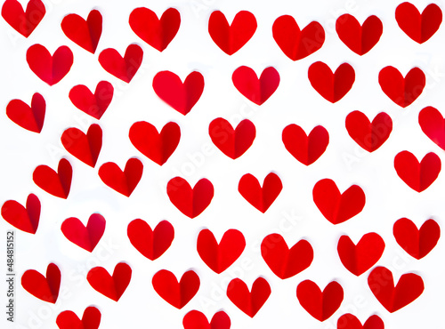 Valentine's day background with red hearts on white background , flat lay