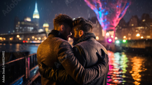 Valentine's Day concept. Couple of two men hugging on the street smiling with a lot of love.