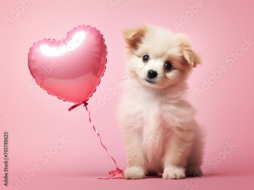 Valentine's Day concept with a cute puppy dog holding a love heart balloon. Generative AI