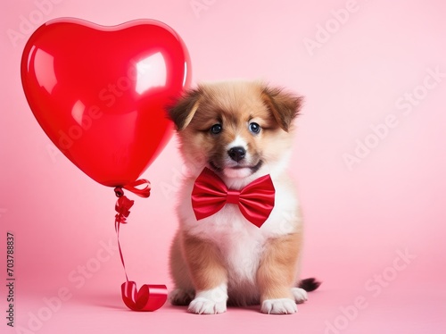 Valentine's Day concept with a cute puppy dog holding a love heart balloon. Generative AI