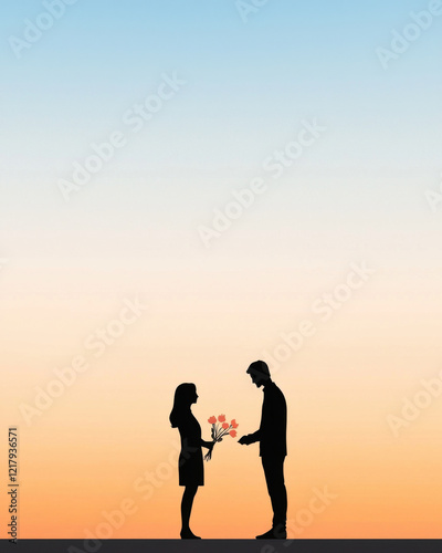 valentines day Couple exchanging flowers at sunset, creating romantic atmosphere