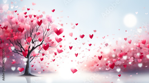 Valentine's day pink background with heart tree and flying paper hearts and butterflies. Generative AI technology.