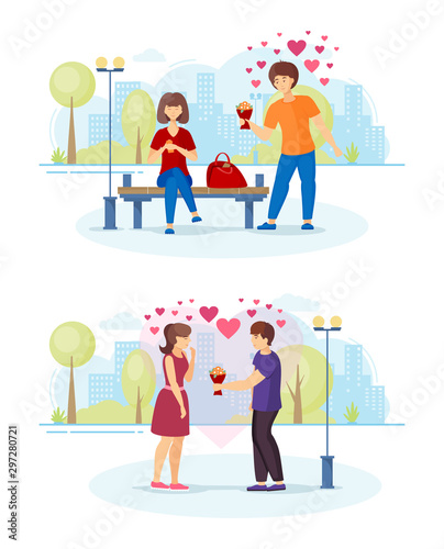 Valentine's day poster with in love couple. Man giving to woman a bouquet of flowers on a romantic date. Vector cartoon illustration