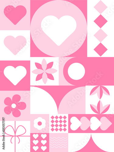 Valentine's day sale background. Love and heart. Trendy geometric shapes with circles, squares and hearts in retro style for a Valentine's Day sale background