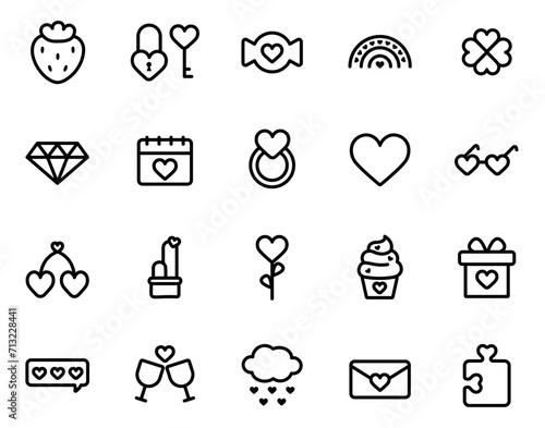 Valentines Day simple black line icons vector set. Set of valentine's day icons, such as celebration, happy, romantic, heart, love. Outline icons collection. Many various romantic objects. Linear