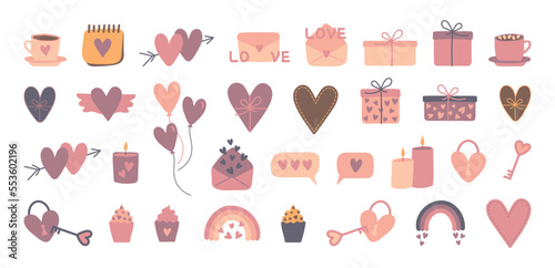 Valentines Day vector collection. Romantic love icons in flat cartoon style. Valentine's day cute illustration set. Gift box, heart, balloons, pancake, rainbow, envelope and others decorative elements