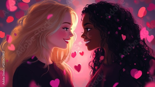 Valentine's Galentine Day: Heartwarming friendship moment, glowing smiles and petals.