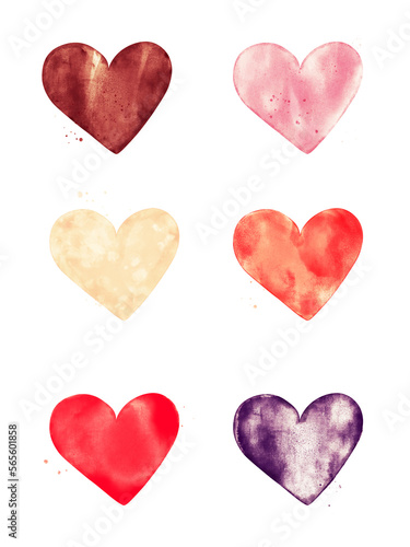 Valentines hearts in mixed colors. Hand illustrated set of watercolor hearts for valentines or mothers day card.