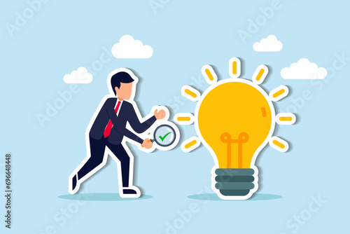 Validate startup idea that have potential to implement and success in real life, analyze and choose best business idea concept, smart businessman verify or validate light bulb idea and make approval.