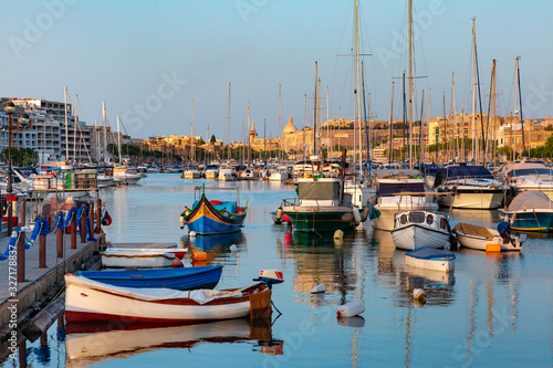 Valletta harbour with yachts and multicolored fishing boats Luzzu with eyes, church and fortress, illuminated by sunset light, Malta