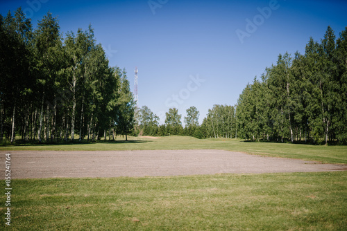 Valmiera, Latvia - June 15, 2024 - A peaceful golf course with green grass, a dirt path, and surrounding trees under a clear blue sky, creating a serene outdoor setting.