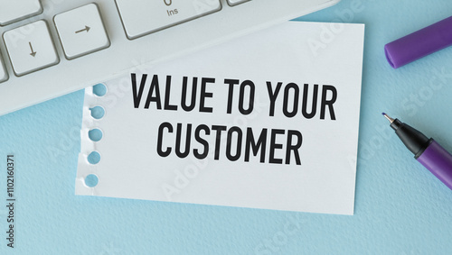 VALUE TO YOUR CUSTOMERS, text on white paper on blue background. business concept