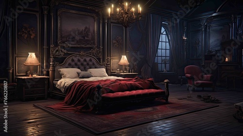 Vampire's Gothic Mansion Bedroom Environment - Interior. AI generated art illustration.