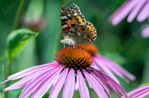 Vanessa cardui sitting on Echinacea purpurea flowering plant, eastern purple coneflower in bloom