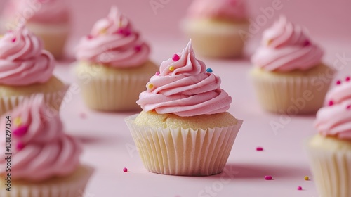 Vanilla cupcakes with pink frosting and sprinkles on pastel background