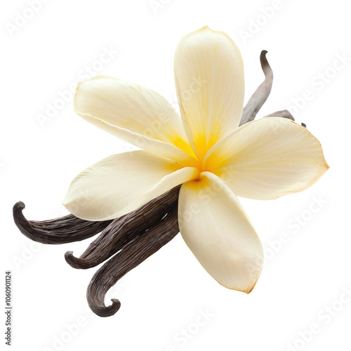 Vanilla flowers and vanilla pods isolated on white or transparent background, png clipart, design element. Easy to place on any other background.