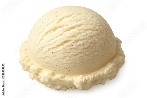 Vanilla ice cream scoop displaying natural bean specks, positioned against transparent backdrop