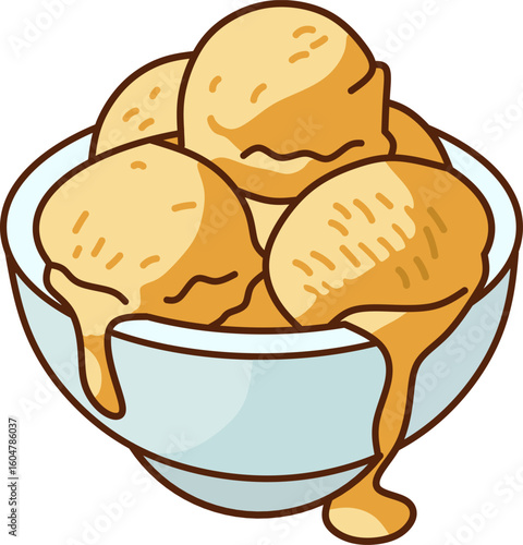 Vanilla Ice Cream Scoops with Caramel Topping in Blue Bowl