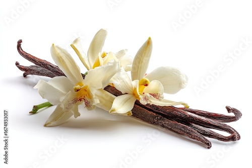 Vanilla orchid pods and blossoms against white