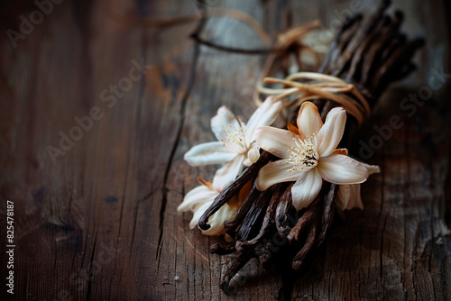 Vanilla pods lie on an old brown wooden table. Vanilla sticks with flowers.