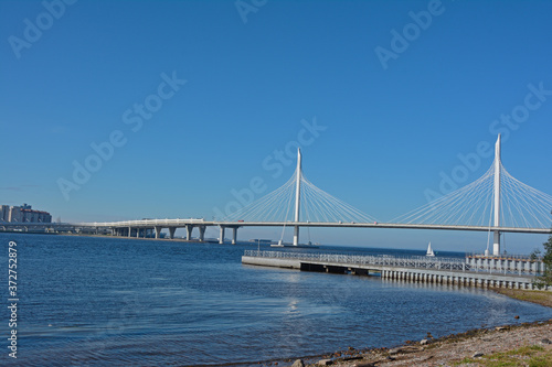 Vansu bridge. Across a large river against a bright, clear, blue sky
