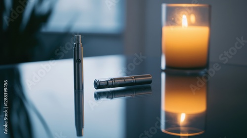 Vaping device on a clean glass table with a small candle beside it. Featuring simplicity and warmth