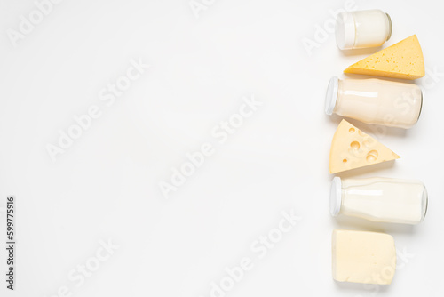 Variation of organic dairy products. Farm cheese, milk, yogurt, cottage cheese on white background with copy space