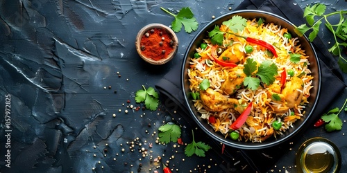 Varieties of Spicy Indian Chicken Biryani from Malabar and Hyderabad Regions. Concept Spicy Chicken Biryani, Malabar Cuisine, Hyderabad Biryani, Indian Spices, Regional Varieties