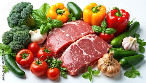 Variety fresh vegetables raw meat on white background. Tomatoes peppers cucumbers garlic parsley basil. Healthy eating, balanced nutrition. Ingredients for cooking steak.