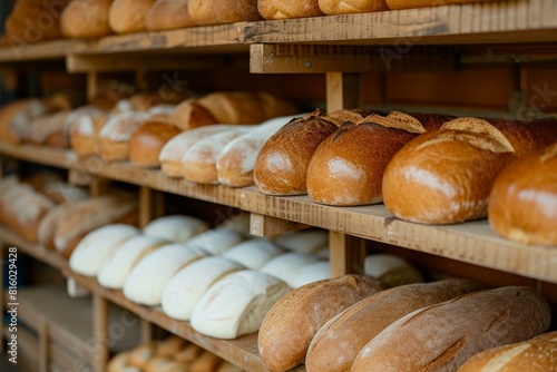 Variety of artisan bread loaves displayed on bakery shelves, showcasing freshness