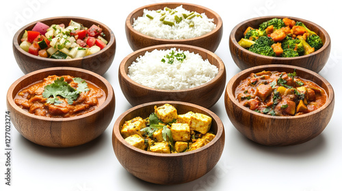 Variety of authentic indian dishes served in wooden bowls, including curries, paneer, rice, and fresh vegetables on a white background.