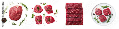 Variety of beef cuts and steaks displayed on a clean white background ready for culinary and cooking