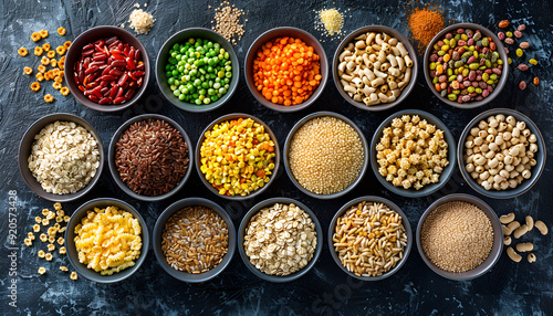 Variety of cold cereals, quick breakfast for kids overhead shot