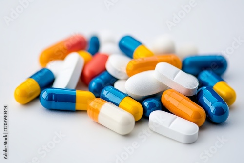 Variety of colorful capsules and tablets scattered on a plain surface for pharmaceutical display