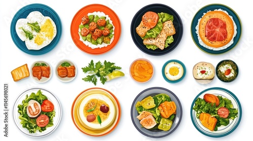 Variety of colorful food plates arranged on a white background showcasing diverse meals for culinary presentation and advertising use.