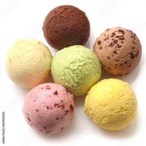 Variety of colorful ice cream scoops arranged, capturing the essence of dessert, refreshment and summer treats.