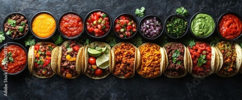 Variety Of Colorful Tacos With Condiments On Dark Background