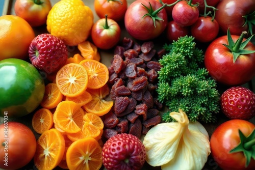 Variety of dried fruits & vegetables, colorful assortment , detail, bright