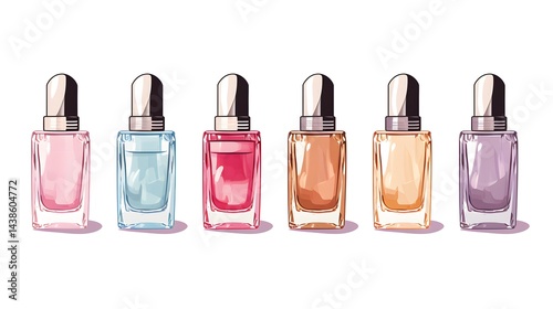 Variety of elegant perfume and nail polish bottles on a white background for cosmetic product display