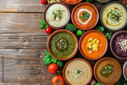 Variety of fall vegetable soups with organic ingredients top view on wood background Homemade vegan soups in autumn colors