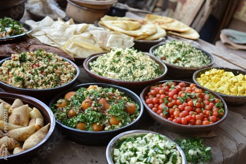 Variety of food displayed on table during ramadan iftar dinner in morocco
