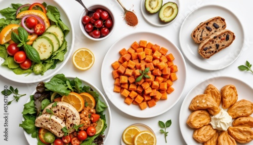 Variety of Fresh, Healthy Dishes Including Salad, Roasted Squash, Chicken, and Baked Goods on White Surface