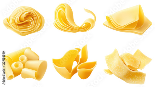 Variety of fresh pasta shapes displayed on a white background in a culinary arrangement