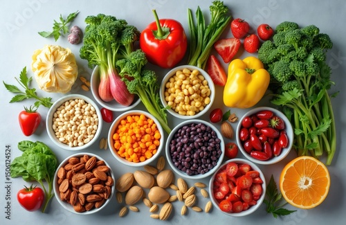 Variety of fresh plant based food ingredients in bowls. Broccoli, tomatoes, nuts, beans, strawberries, orange, bell peppers, vegetables. Healthy balanced diet. Vegetarian vegan food. Top view on grey